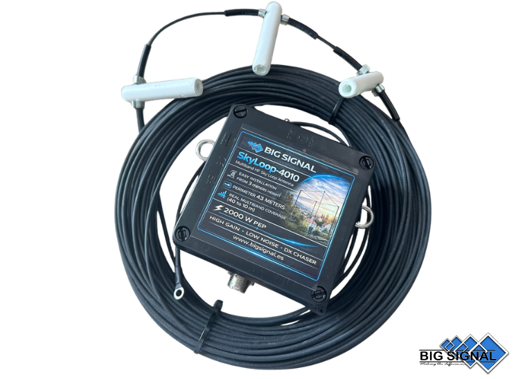 La BIG SIGNAL SkyLoop-4010 es una antena loop cerrada multibanda diseñada para radioaficionados que buscan máxima eficiencia en DX sin necesidad de grandes alturas. Funciona como loop de onda completa en 40 metros y, aprovechando sus armónicos naturales, ofrece un rendimiento excelente en 20, 15, 10 y 6 metros, sin necesidad de ajustes ni acopladores externos.